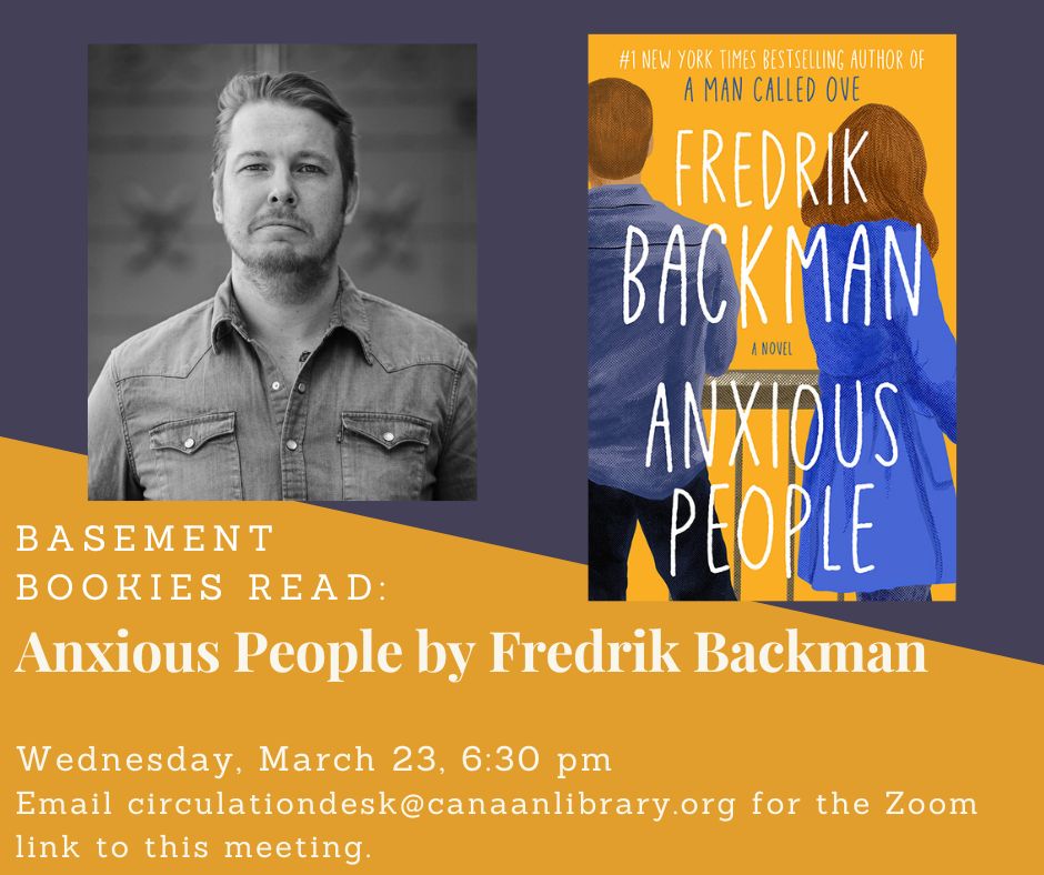Basement Bookies Read: Anxious People by Fredrik Backman. Join us for our Virtual Discussion on Wednesday, March 23 at 6:30 pm. Email circulationdesk@canaanlibrary.org for the Zoom link to this meeting.