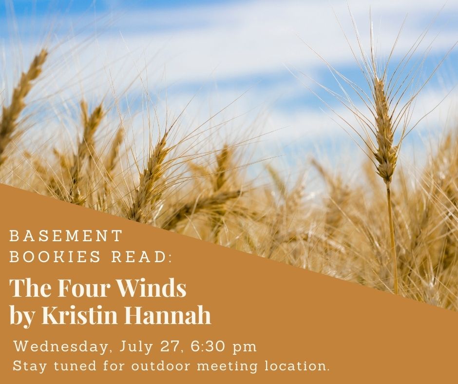 Join us to discuss The Four Winds by Kristin Hannah on Wednesday, July 27. Stay tuned for the location of this outdoor meeting.