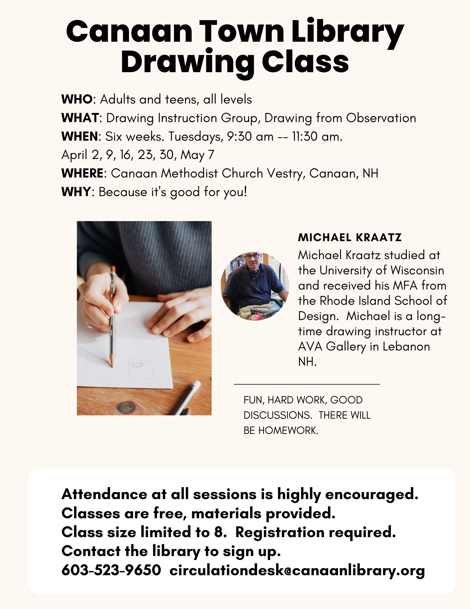 Registration is full. Contact the library to be put on the waiting list. Join Michael Kraatz for a 6 week drawing class for teens and adults. April 2, 9, 16, 23, 30, May 7, 9:30 am – 11:30 am. Class will meet at the Canaan Methodist Church Vestry. Attendance at all sessions is highly encouraged. Classes are free, and all materials are provided. Class size is limited and registration is required. Contact the library to sign up. 603-523-9650 circulationdesk@canaanlibrary.org.