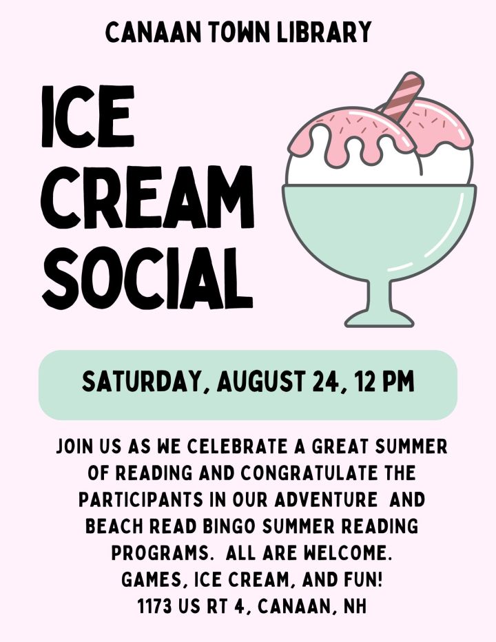 Join us Saturday, August 24 at 12:00 pm as we celebrate a great summer of reading and congratulate the participants in our Adventure and Beach Read Bingo Summer Reading Programs. All are welcome. Games, Ice Cream, and Fun! 1173 US RT 4, Canaan, NH.